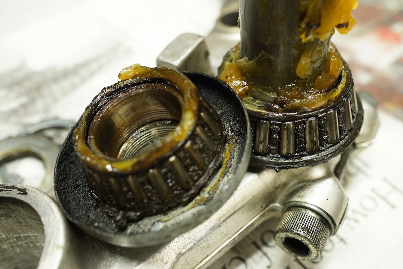 重く・渋くとても軽快には乗れるコンディションではありませんね。グリスの状態からしてかなり時間が経過しものと思われます。