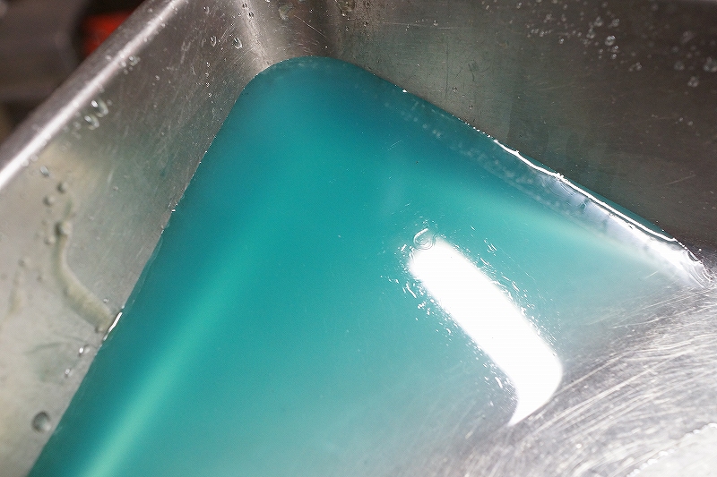 微妙にテラっているのは成分でしょうか?茶色ではないのでエンジンオイルではありませんね。取り合えず次回も確認しましょう。上から何度も水を流してお水の通路を掃除します。