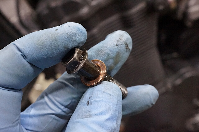 この時代は二面幅21MMと言う使い辛いサイズの頭をしております。現行の17MMドレンに交換しておきます。たまにドレンボルトを交換すると気持ちよいですよ。