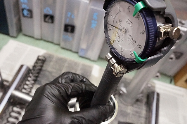インナーチューブは測定しても最近あまり意味を感じなくなってきました。メッキ後に研磨をしているものですが長物ですので当然上下で100分台での差はあります。メッキが剥がれカジっている状態でも数字的に恐ろしく減っている状態ではありません。上下でメタル支持しているので当然でしょう。