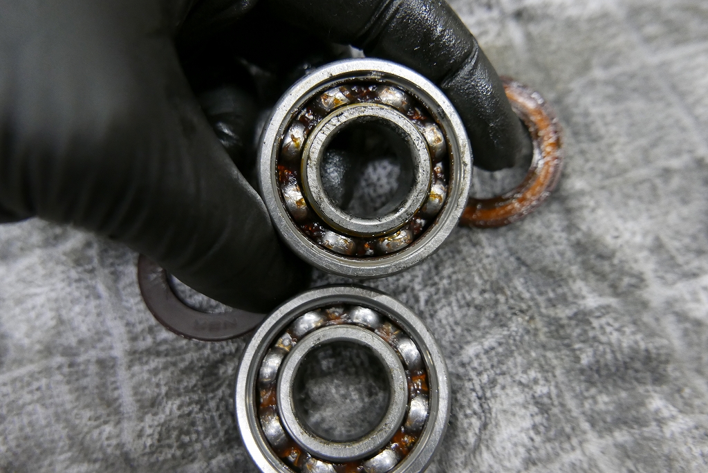 シールベアリングですが中を確認。グリスも少し飛んできてますね。グリスが無くなれば一気に寿命が縮まります。常に回されているホイールベアリングは2-3万キロで交換しても良いと考えます。