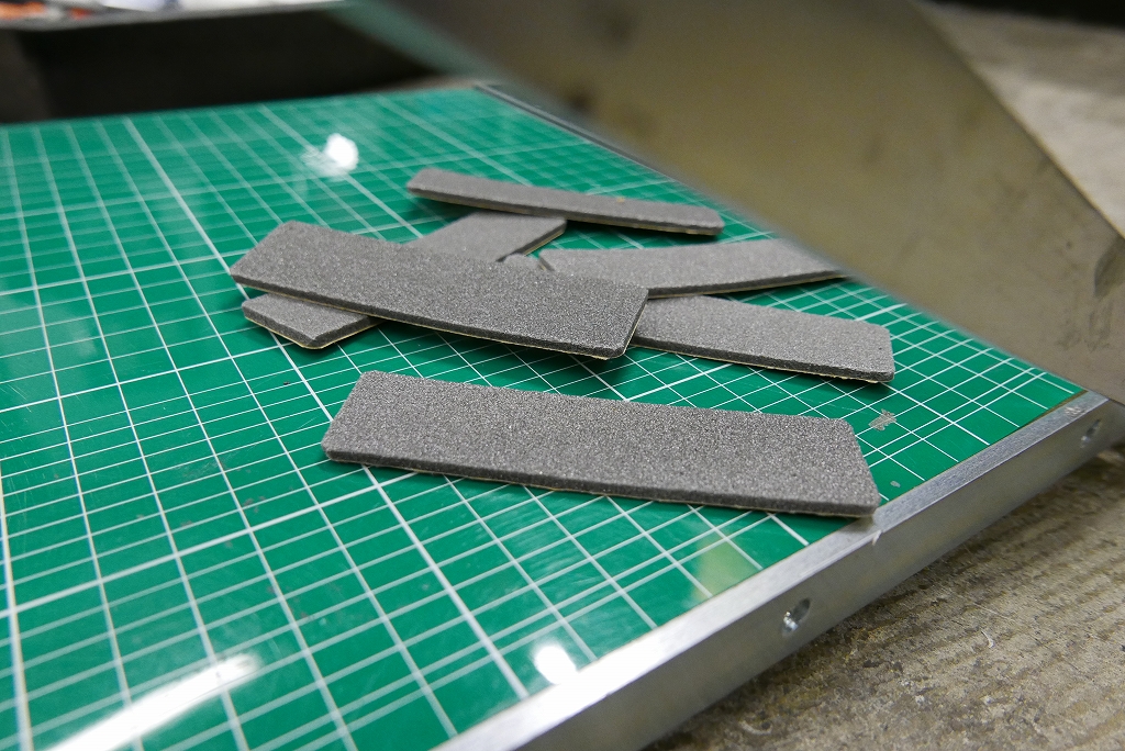 綺麗なバッテリーケースへ交換します。スポンジを指定寸法にて切っておきますね。この様な紙を切断する道具があると綺麗に切断できます。