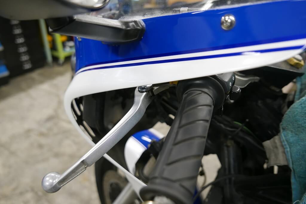 レーシーなカウルのお陰で腰が痛いほど低いハンドル。もう少し高くできないか?との事。