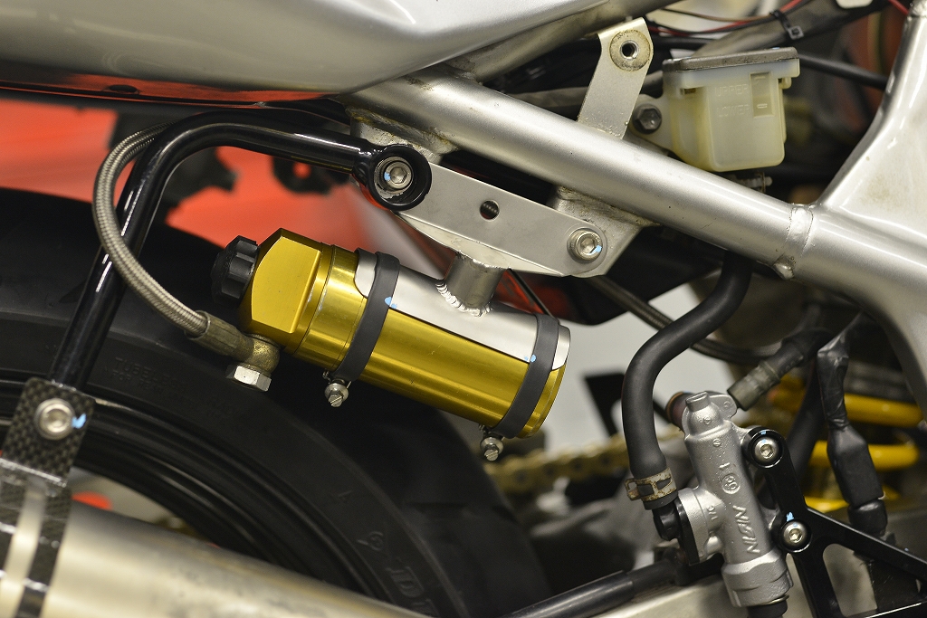 なんか用?のオーリンズを装着して欲しい。取り付けは出来ましたのでリザーバーステーは簡素に・・・裏波出て汚いですね。