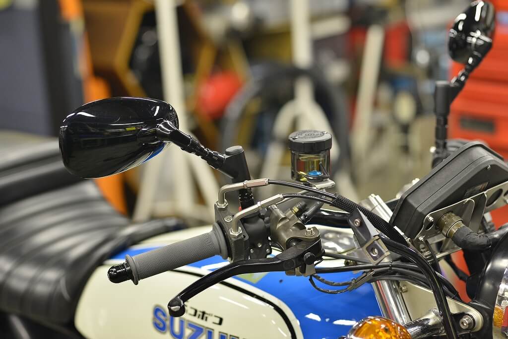 ミラーも大きな純正品。最近のミラーは見易くて調整も楽ですね。緩めなくて主軸側は動きますからね。