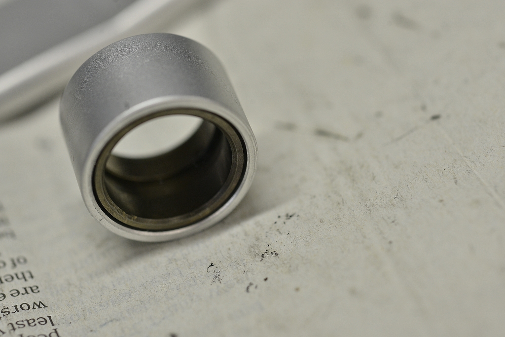 オイルレス(GSXR1100の中古)を抜き。ペダル軸になるカラーを+2/100位で切削して温めてから手で圧入。