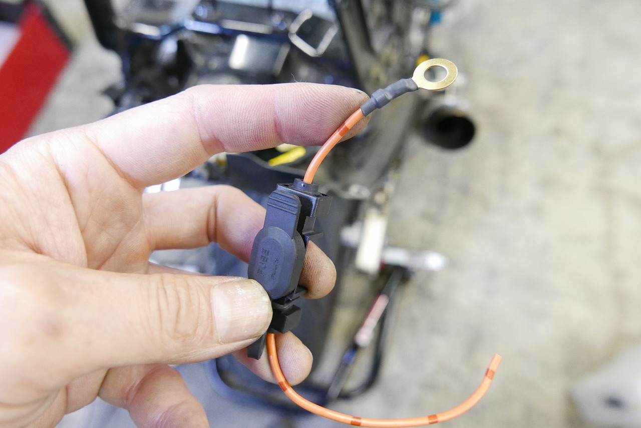 自身でバッテリー充電器のアクセサリを取り付けました。その配線をいい加減にブランブランでサイドカバーやシートブラケット類で挟むとしましょう。