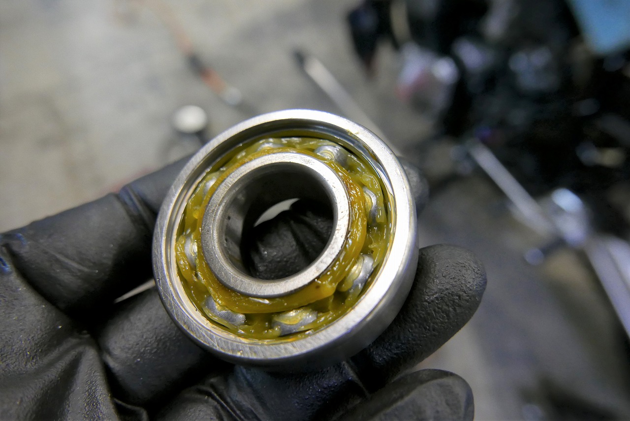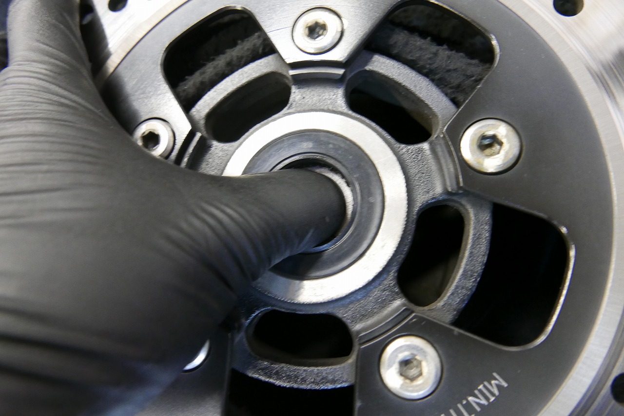 妙~に違和感あるホイールベアリング。ディスタンスカラーの位置を調整すると”コリ・・コリ・・”って。グリス切れかな?とシールをはがしてもタップリ。
