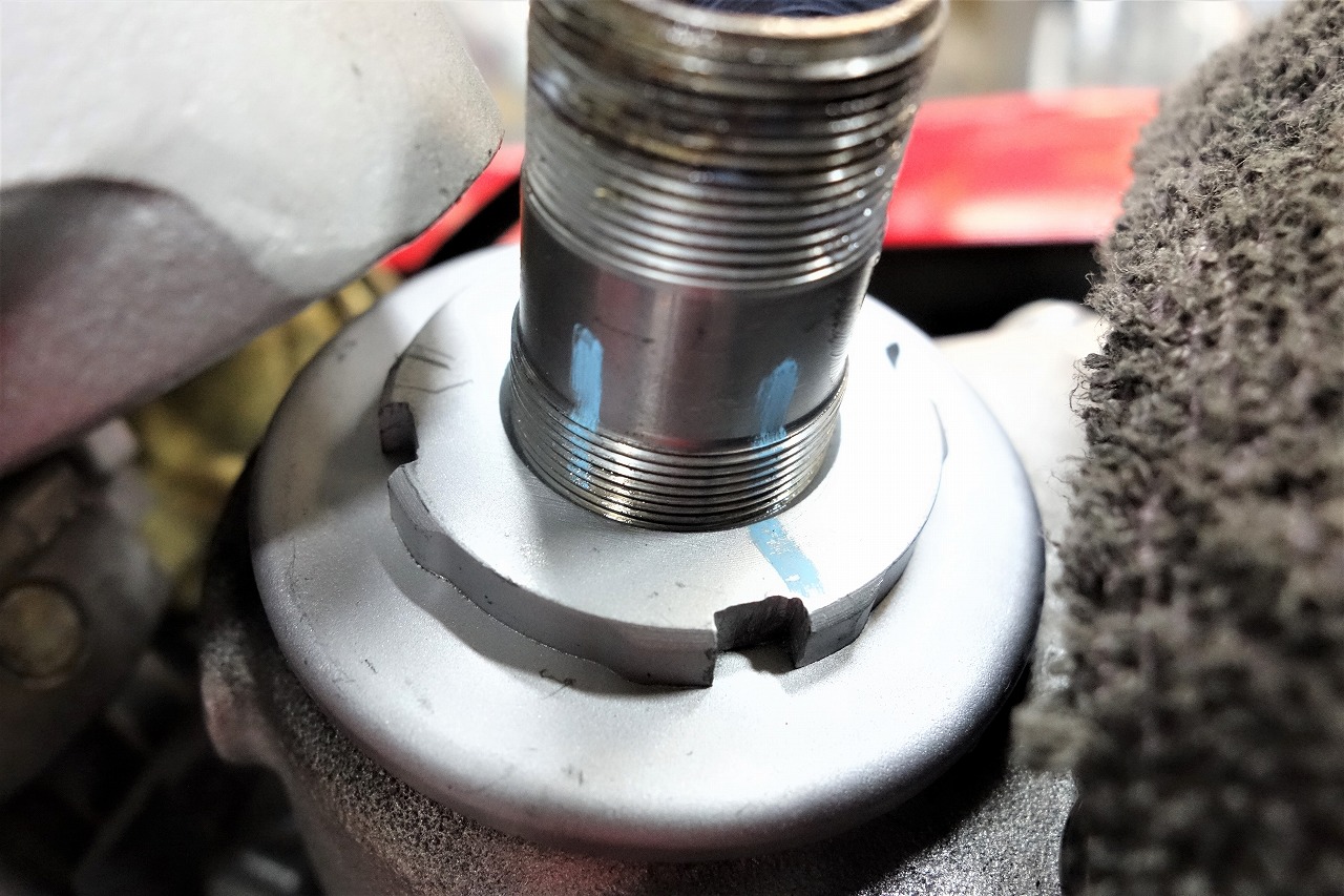 私は分解し組み付け時にと線を引いておきます。かなりしっかり締め付けしてシールを潰しつつベアリングが押されている感じ取った線(左側)。手で締めて軽くレンチでの線が(右側)です。