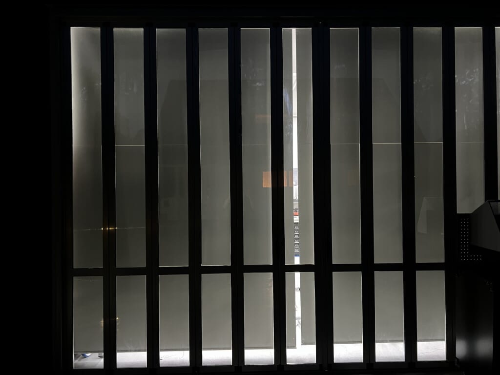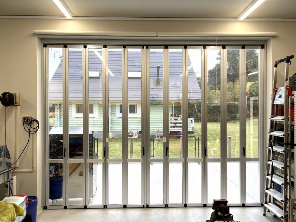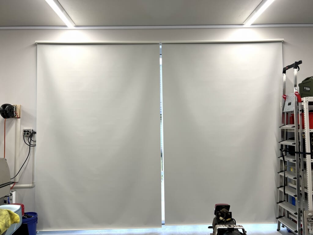 「バイクガレージ通信」完全な虫対策!抜群のロールスクリーンは立川ブラインド。シエロン遮光1級で「高さ3m幅2m」まで対応可能!しっとりと巻き上がります。