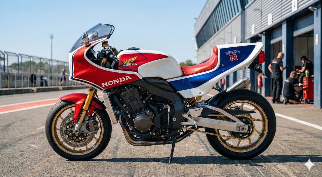 AI生成の結果: 最新の空力カウルと、CB1100R特有の赤白カラー&角目ライトが違和感なくマッチした、理想のネオクラシックが完成。