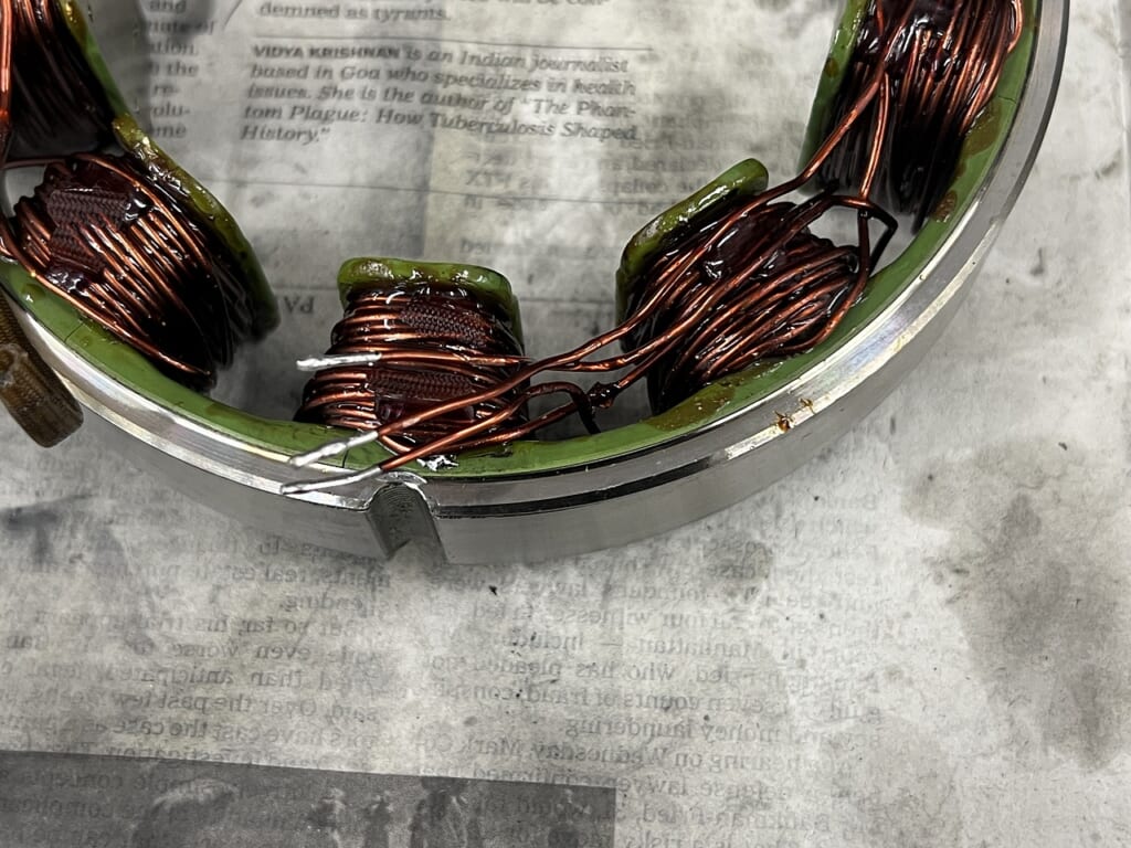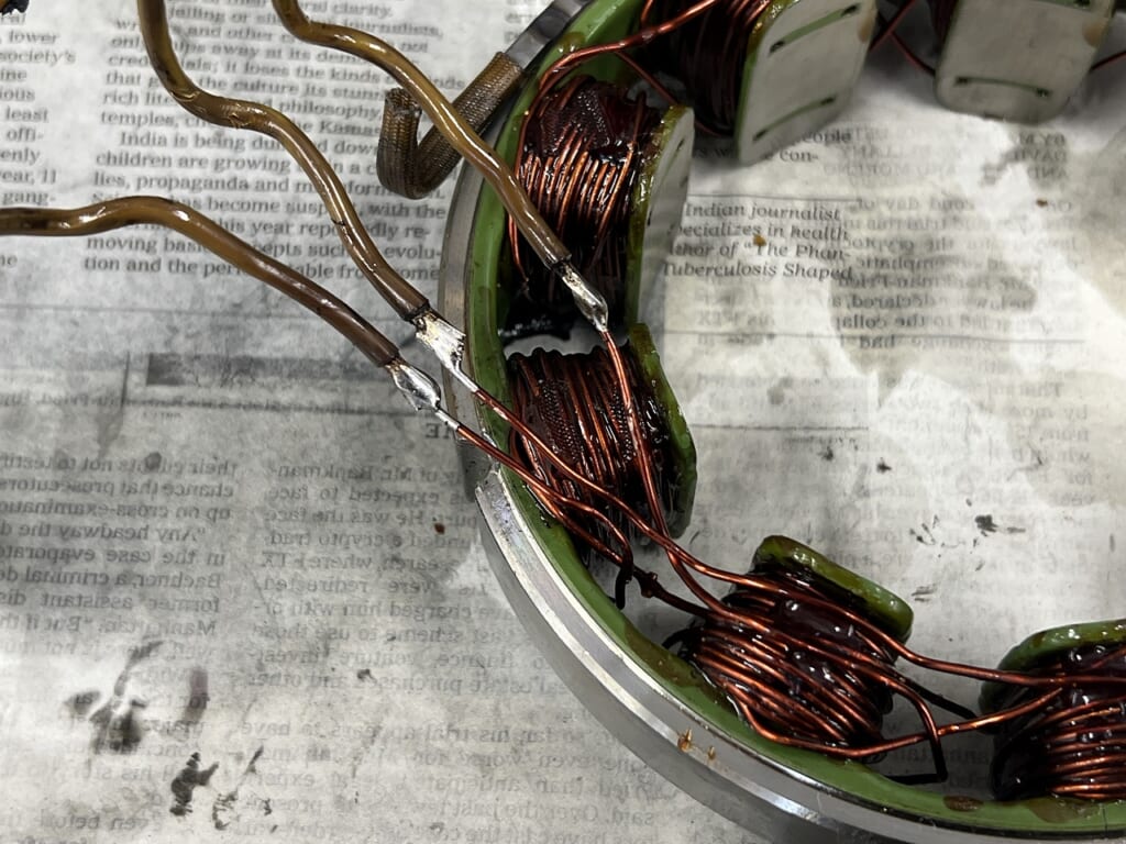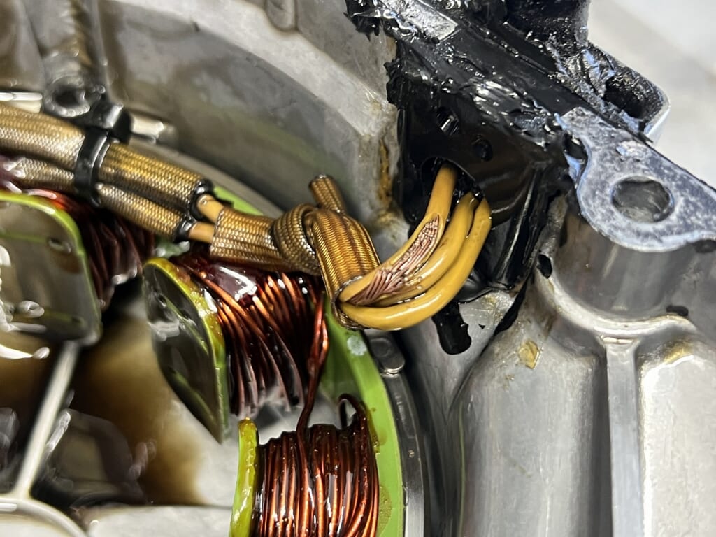 原因: 経年劣化でステーターコイル配線のゴムグロメットが硬化・収縮し、隙間ができていたため。